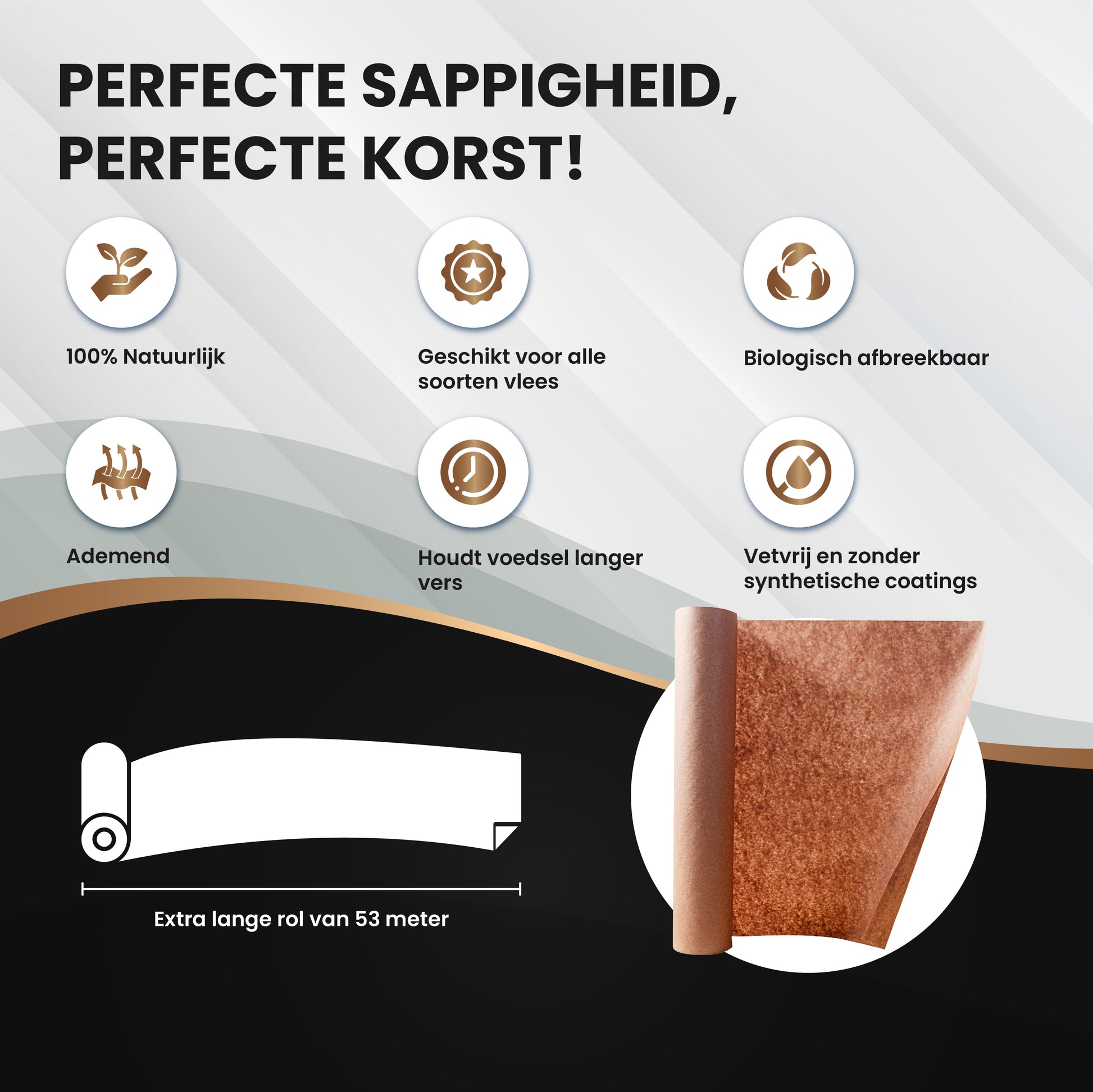 Het slagerspapier behoudt de meeste warmte, terwijl het vlees nog steeds kan ademen. Hierdoor wordt vocht vastgehouden en blijft die prachtige, dikke korst op je gerecht behouden. Geen compromissen meer als het gaat om smaak en textuur.