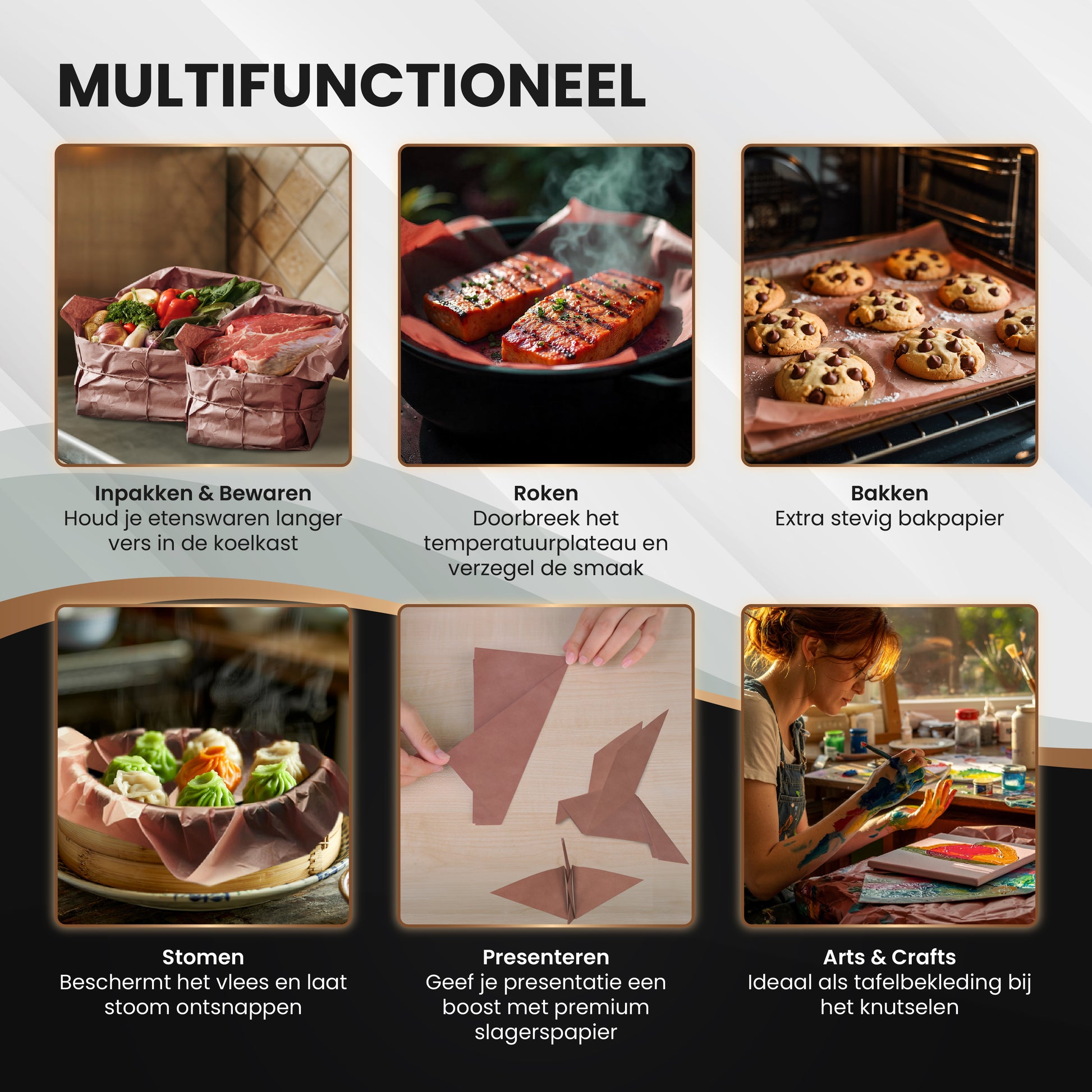 Bereik culinaire perfectie en behoud sappigheid en smaak met ons hoogwaardige slagerspapier – de ideale metgezel voor elke barbecue en rooksessie.