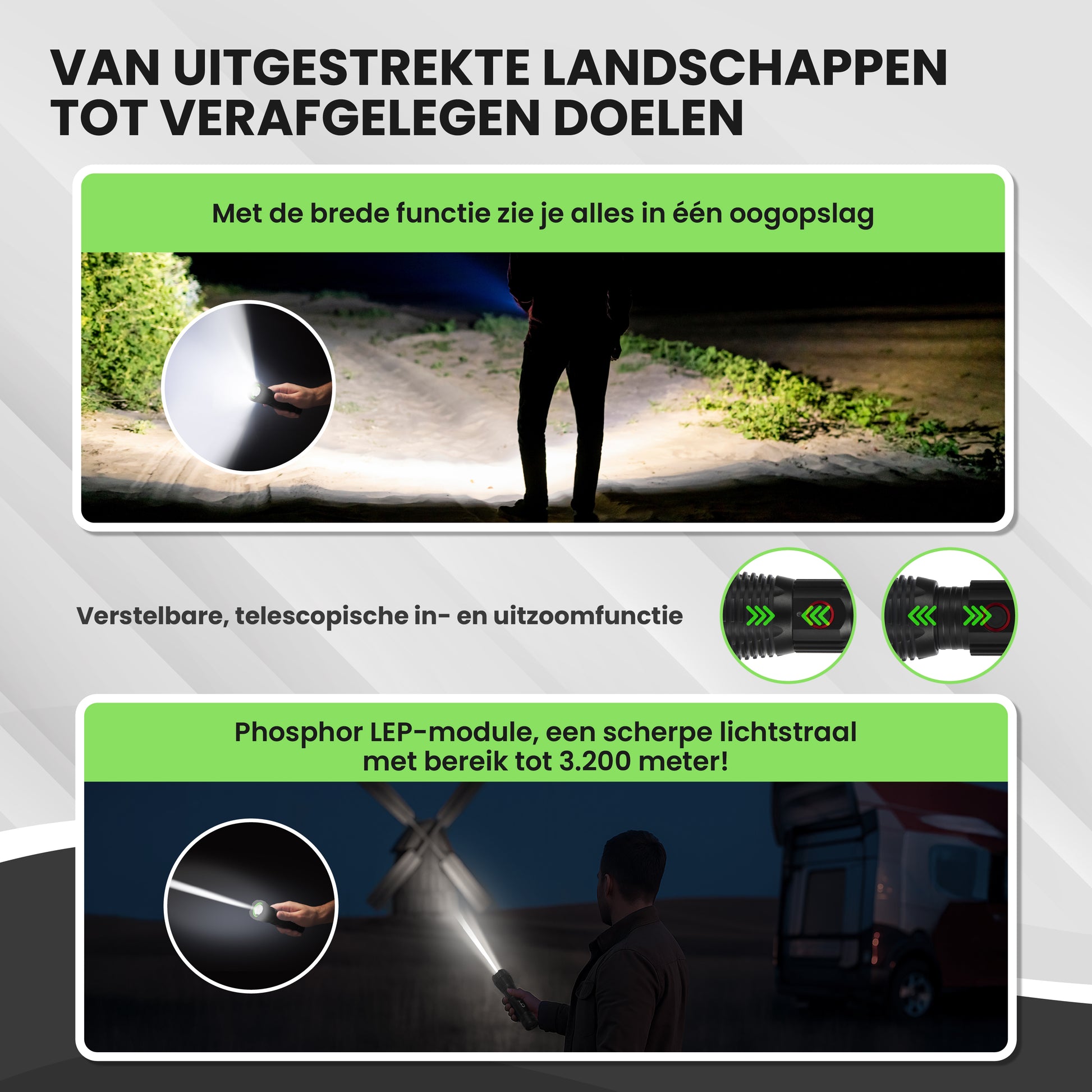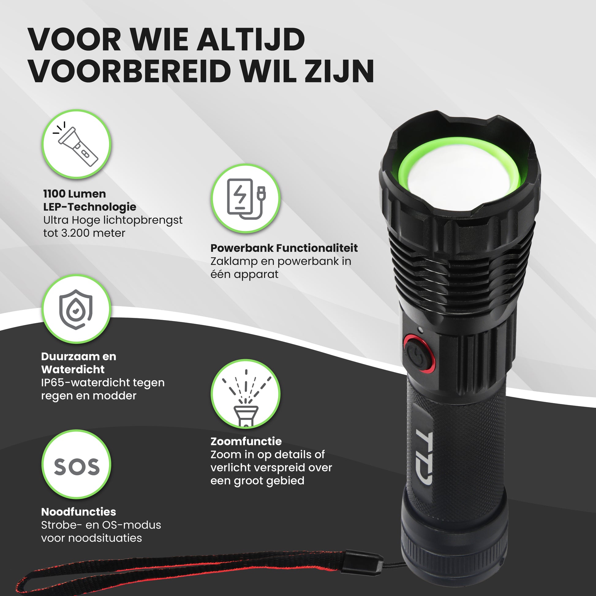 TTD® Militaire Zaklamp LED Oplaadbaar - LEP Technologie - IP65 Waterdicht - 1100 Lumen - 7 Uur Accu - Zoomfunctie - Powerbankfunctie - USB Oplaadbaar