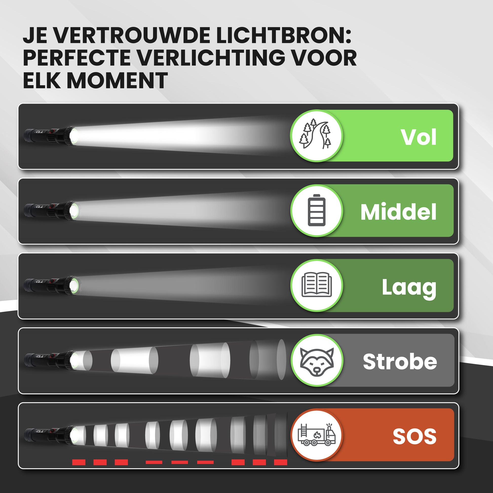 - Noodfuncties: strobe- en SOS-modus voor noodgevallen