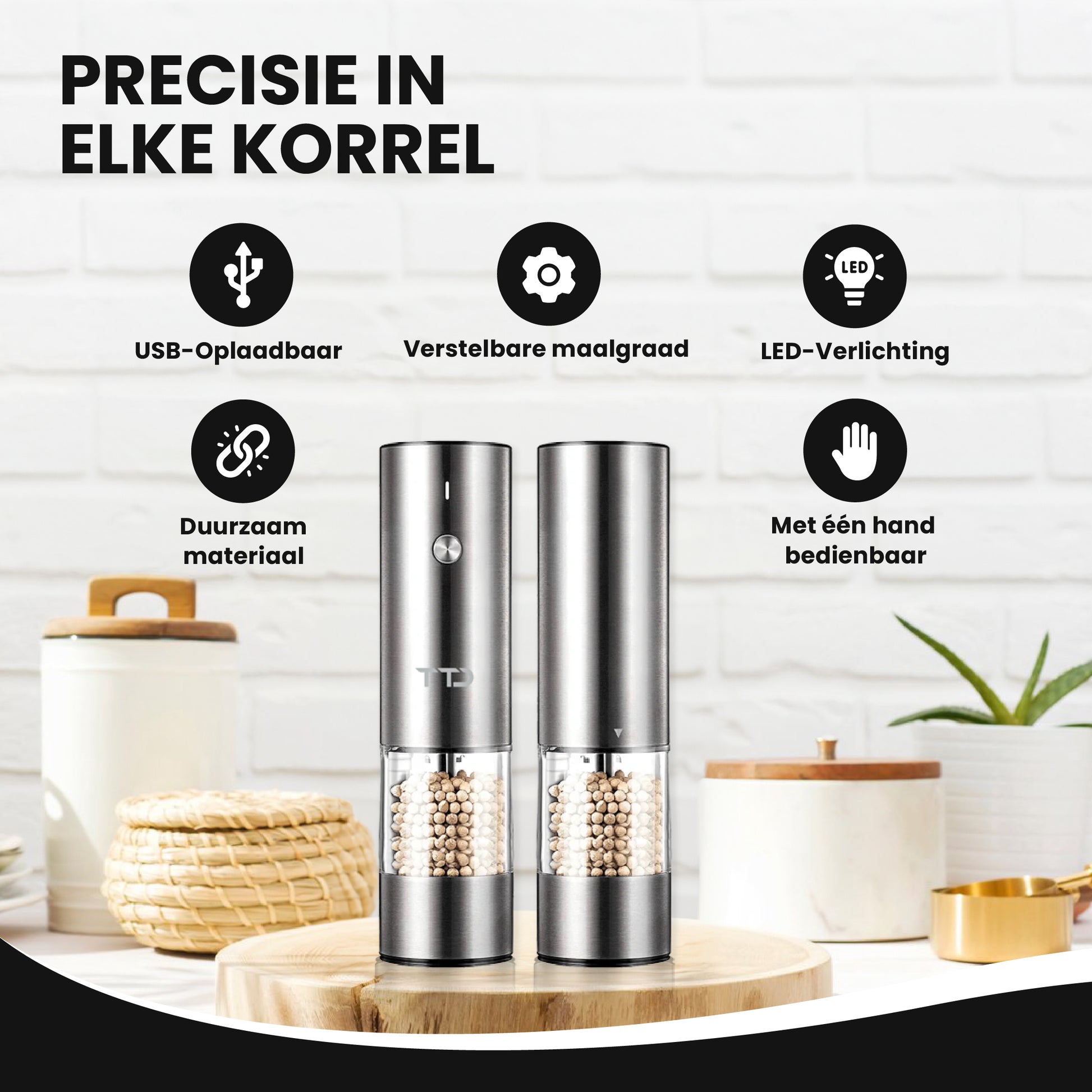 TTD® Premium Zout en Pepermolen Set Elektrisch RVS XXL - 75 ml Capaciteit - USB-oplaadbaar - Peper en Zoutmolen set - Kruidenmolen - Zoutmolen - Pepermolen - Peper en Zoutmolen Oplaadbaar - Verstelbare maalgraad - LED-verlichting - 2 stuks