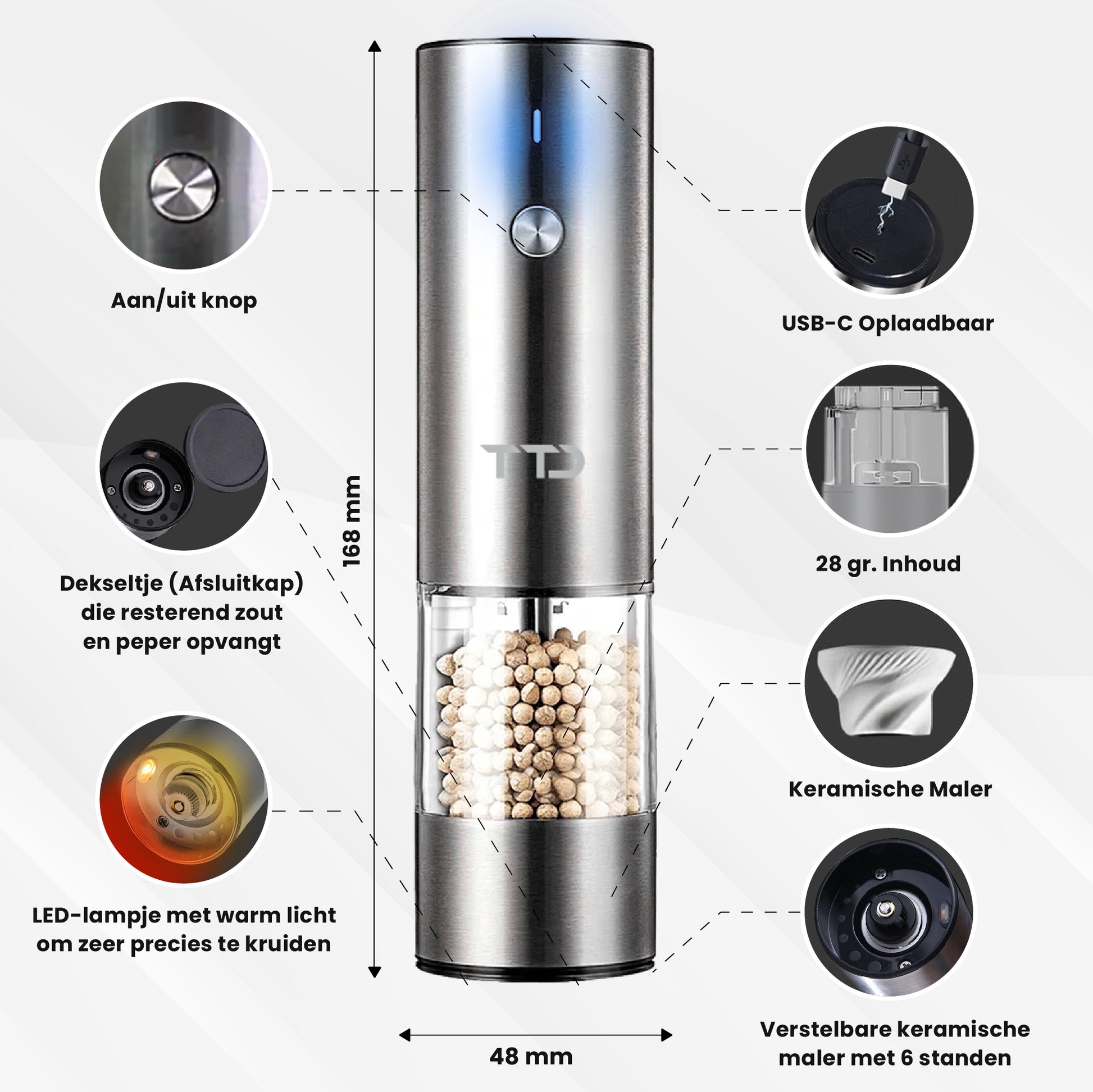 In de keuken kennen we allemaal het gedoe van handmatige molens en het constante zoeken naar de perfecte smaakbalans. Zeker als we met één hand vlees aan het bereiden zijn, is de schone hand niet eens genoeg om de handmatige molen te bedienen! De TTD elektrische zout- en pepermolen set biedt dé oplossing voor het moeiteloos malen van zout, peper en andere kruiden. De molen is te bedienen met één hand, wat deze zeer makkelijk in gebruik maakt! Daarnaast kan je zelf de maalgraad instellen, zo maak je de kruiden zo fijn of zo grof als je wilt. Ook zijn de molens voorzien van LED-verlichting, zodat je precies kan zien hoeveel kruiden worden gestrooid, hiermee zorg je voor de perfecte dosering en een smaakvol gerecht! Als laatste zijn de molens ook oplaadbaar met het meegeleverde kabeltje. Geen losse batterijen dus!