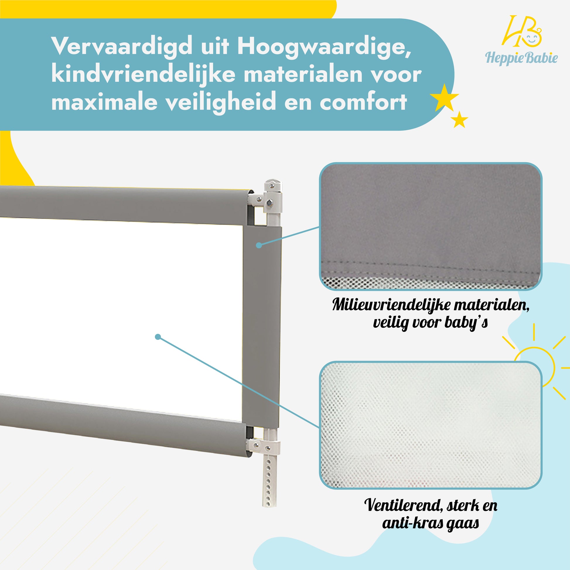 HeppieBabie Bedhekje - Universeel - Extra Lang 150 CM - Verstelbaar - Grijs met opvangnet - Bedrand - Bedrail - Bedrek