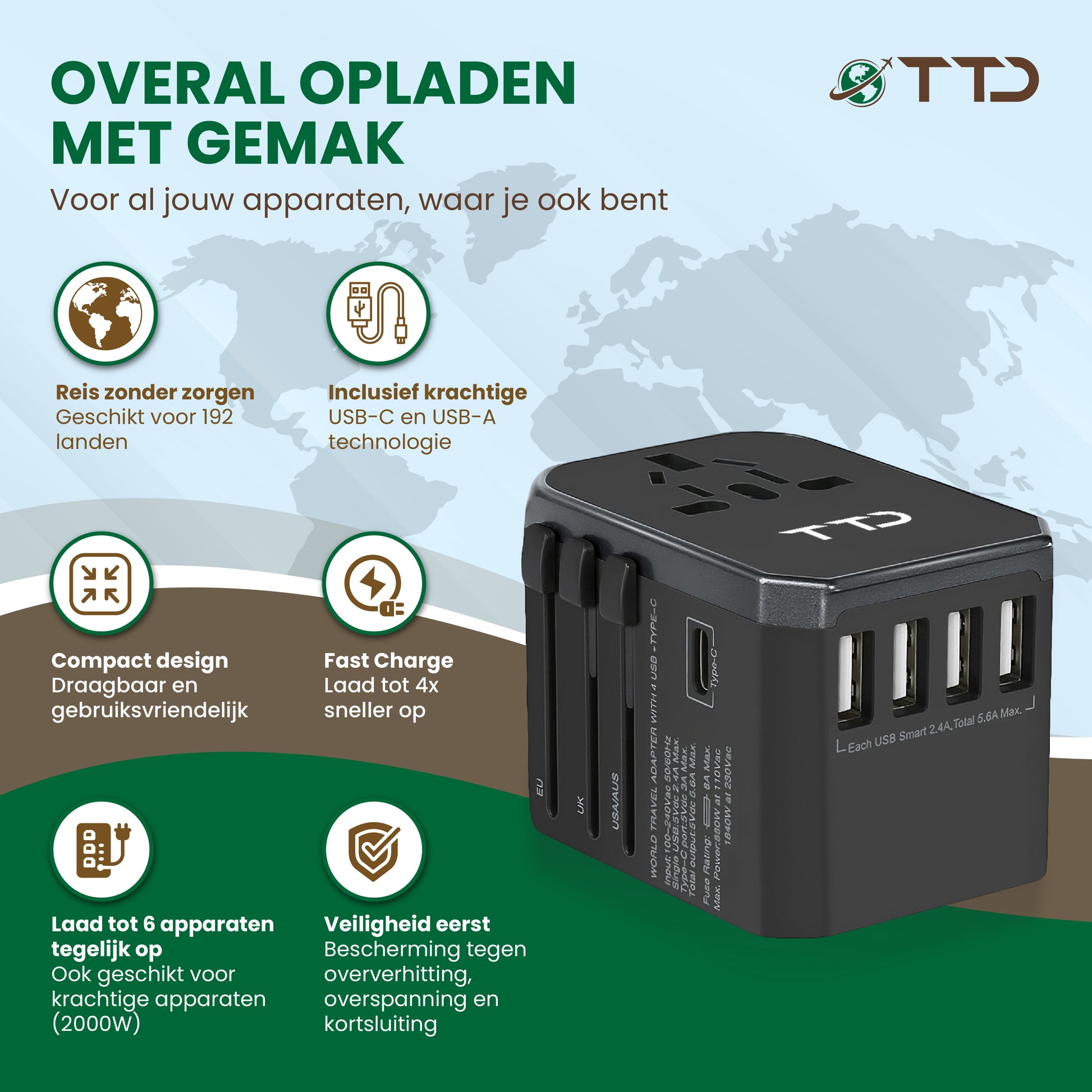 TTD® Wereldstekker Universeel - Reisstekker Type A B C E F G I met USB-C en 4x USB-A Fast Charge - Geschikt voor o.a. Amerika, Australië, Engeland en Japan - Reisadapter - Travel Adapter