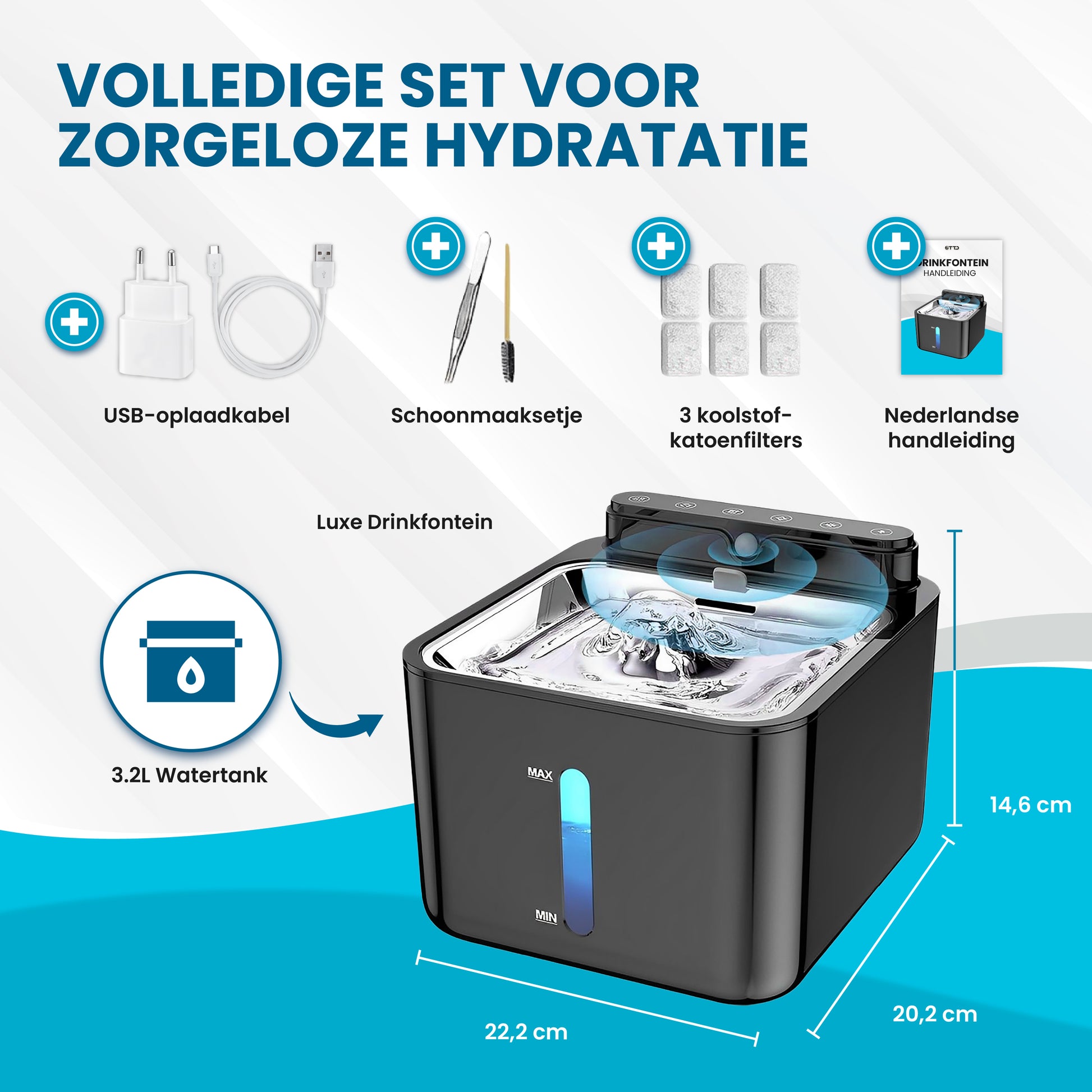TTD® Luxe Premium RVS Drinkfontein met Sensor - Draadloze Drinkfontein Geschikt voor Hond en Kat - Extra Groot Reservoir van 3.2 L - 4000mAh Batterij - RVS- BPA Vrij - Incl. 3 Filters en Cleaning Tool - Fluisterstil