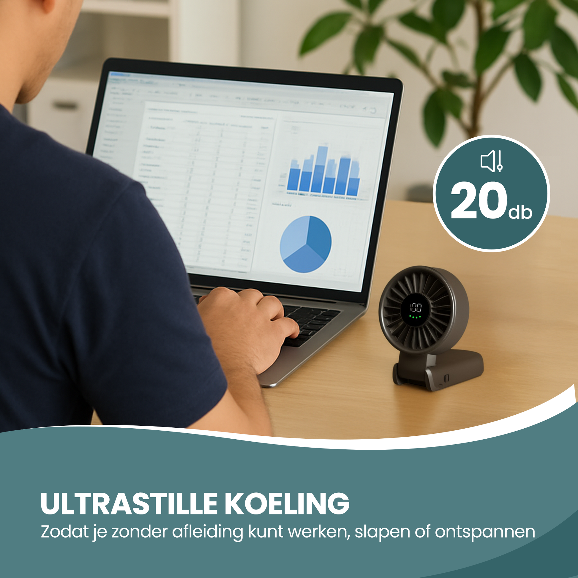 De krachtige 5000 mAh batterij zorgt ervoor dat je tot wel 19,5 uur kunt genieten van een verfrissende wind op de laagste stand. Klaar met gebruiken? Dankzij het 150° opvouwbare design klap je hem eenvoudig dicht en past hij in elke tas. Ideaal voor onderweg, op vakantie of tijdens lange werkdagen. Daarnaast is de ventilator oplaadbaar via USB-C, zodat je hem ook onderweg makkelijk op kunt laden. Nooit meer gedoe met losse batterijen!