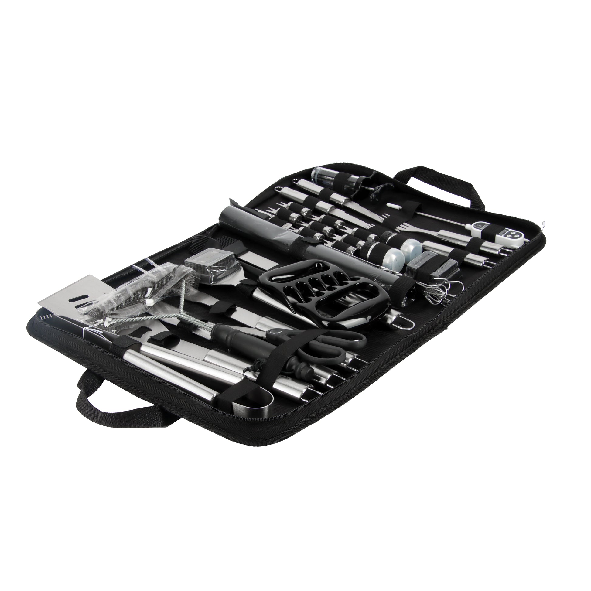 Complete 40-delige set van barbecuegereedschap voor elke BBQ-gelegenheid; onder de BBQ accesoires zitten o.a. een tang, spatel, schoonmaak borstel en vleesthermometer; de BBQ gereedschapset komt met een opbergtas